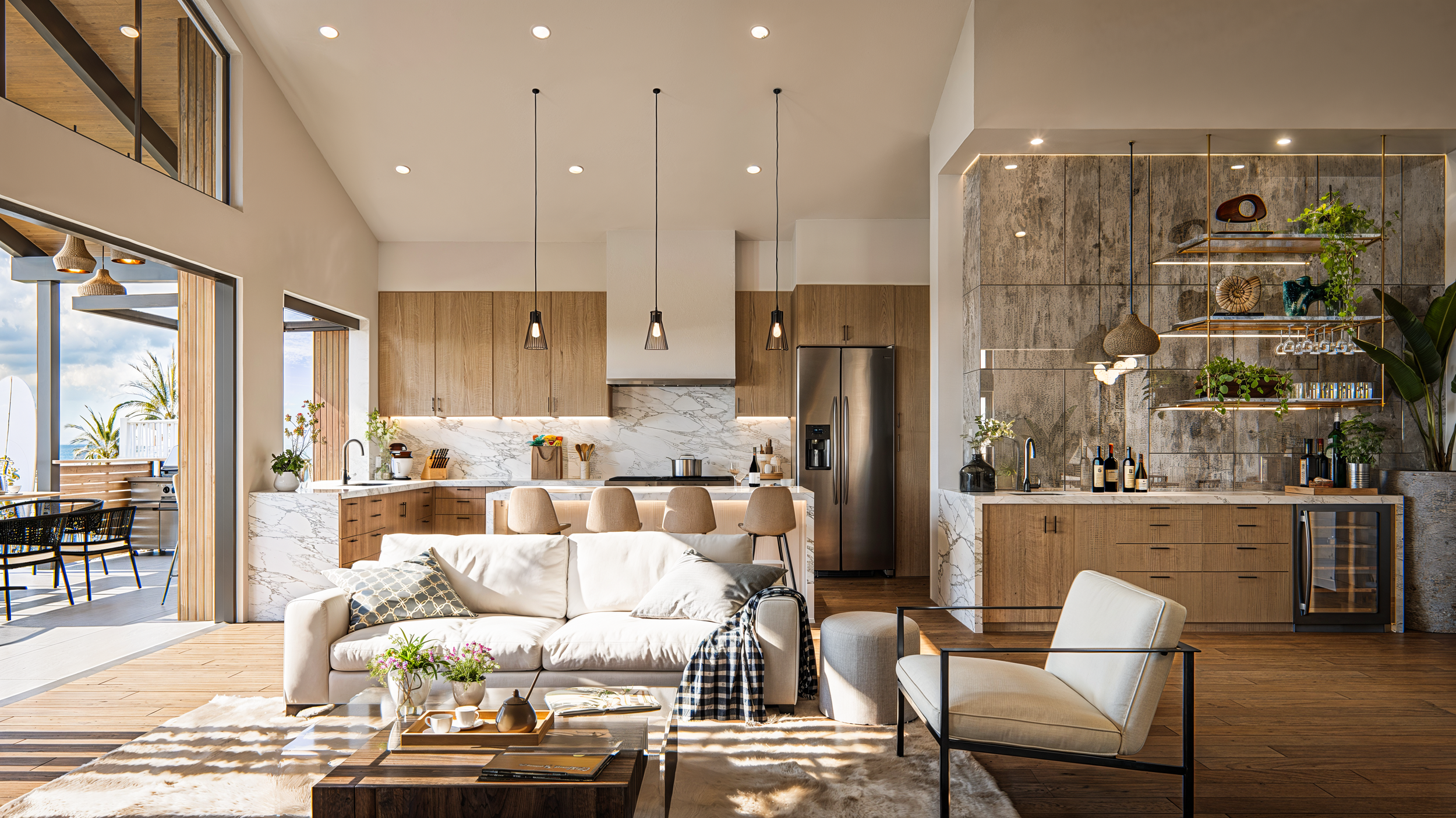 A statement quartz waterfall island with full-height backsplash defines the kitchen, complemented by a wet bar crafted for refined entertaining.